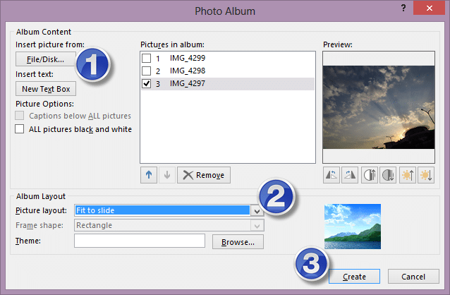 - By default it creates one slide per picture and resizes the picture to fit the slide
