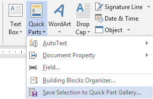 Be on the lookout for text which is reusable. Select it and choose Insert – Quick Parts – Add to Quick parts gallery.