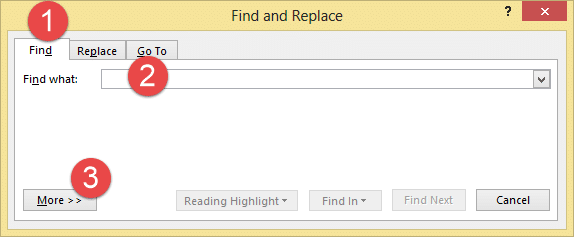 Click on the Find tab click inside the Find What textbox and click on More button…