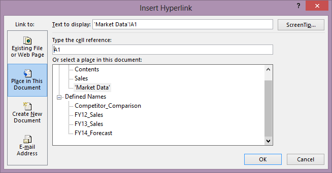 Select any range in a worksheet. Go to the name box, type a name and press ENTER. No spaces allowed in the name. Now these names appear in Hyperlink Dialog. You can also create and edit names using Formulas tab – Name Manager.