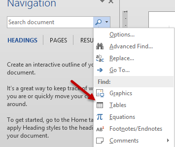 Often documents contain lot of tables. Tabular data is easier to grasp and imbibe. The explanatory text can be skipped if the tabular data is looking alright. Using Find, you can ask Word to jump to only tables and then move from next to previous table quickly.