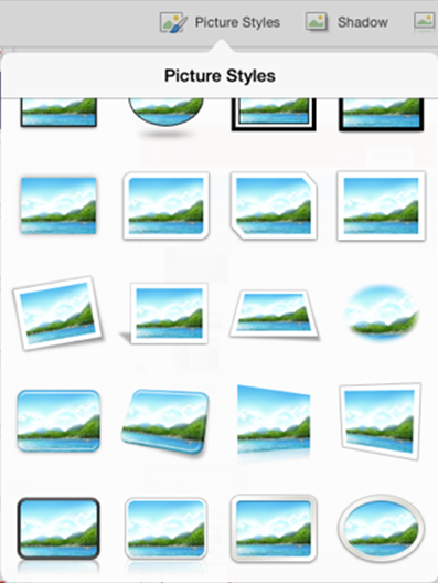 Picture styles, Shadows and Reflections are three galleries available to modify the pictures. Sophisticated things like Artistic effects, Background Removal, Recoloring, etc. can only be done on the PC.