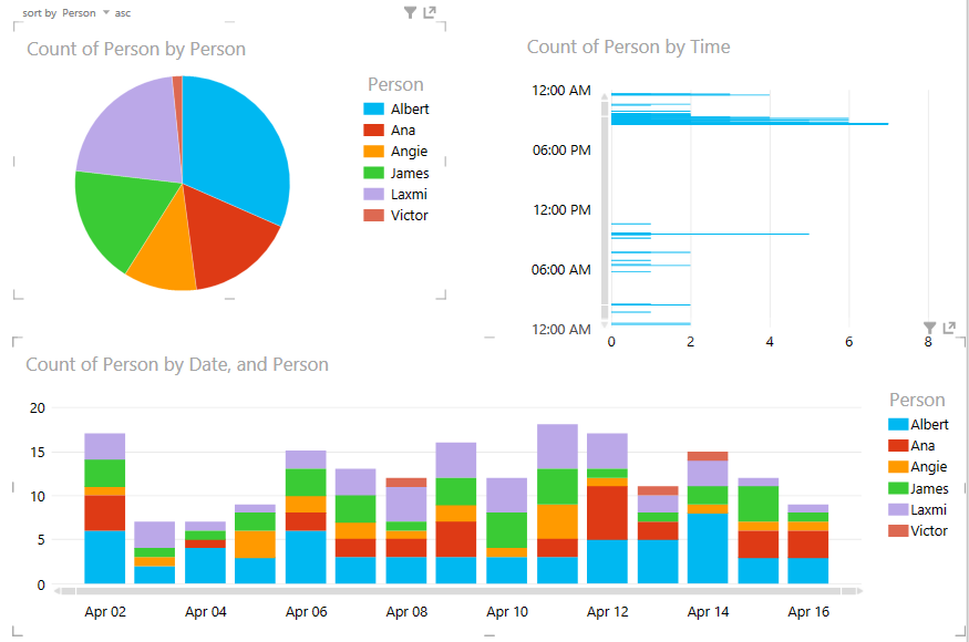 Here I have a simple Power View dashboard of the data with three charts. Who posted when by date, Posts by person Pie chart and Posts by time. All these charts are based upon all the posts.