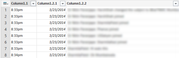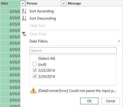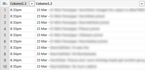 The data gets mixed up if there are CRLF (Enter key) within the messages. To clear those rows, I removed anything with Null in the Date column. You will need to look at your data and you may need to use a different approach.