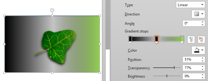 Because of the transparency, the leaf is visible. The rest of the area (other than the leaf) is just the white background of the slide. Therefore the black mixed with it to create shades of gray on the left side and lighter shades of green on the right side.