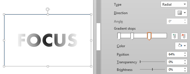 In this example, an interesting text effect is achieved by using three stops. This is the radial effect therefore the leftmost stop is in the center. The left stop is fully transparent, the middle one is 38% transparent and rightmost is zero percent transparent.