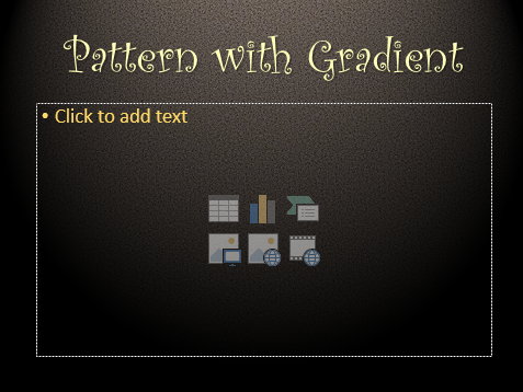 To get this type of effect, go to slide master and fill the background with a pattern. Add a rectangle which completely overlaps the background. Send to Back so that it does not interfere with the textboxes and then play with gradients to get the desired effect.