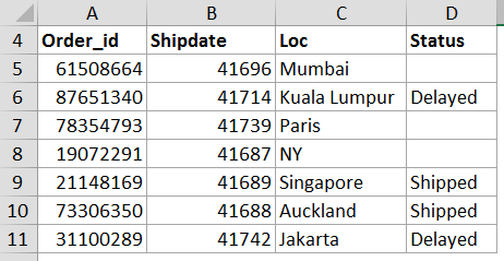 Consider this data. Status is the last column. Based upon the status we want to highlight the entire row. This is a simple example. But in real life, the data is usually spanning across multiple columns and you cannot see all columns at once.