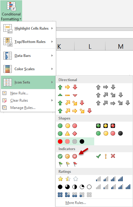 This time we will use a different set of icons (visual elements) by choosing – Home tab – Conditional Formatting – Icon Sets –