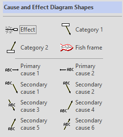 The shapes available with the diagram are simple. The main shape is for the effect. Two kinds of shapes for Causes (above the line or below the line) and an optional fish bone shape.