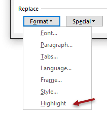 Click inside the Replace with checkbox and again open the Formatting dropdown to choose Highlight.