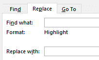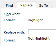 Click inside the Replace with textbox, click on Formatting again and choose Highlight again. Now the Replace with area shows No Highlight. This is what we want. In effect it will Remove all Formatting.