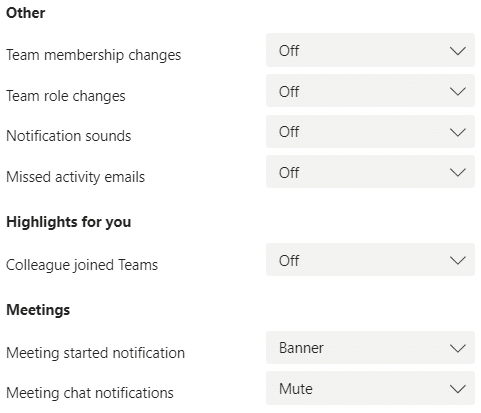 Suggested, least intrusive Teams Notification settings.