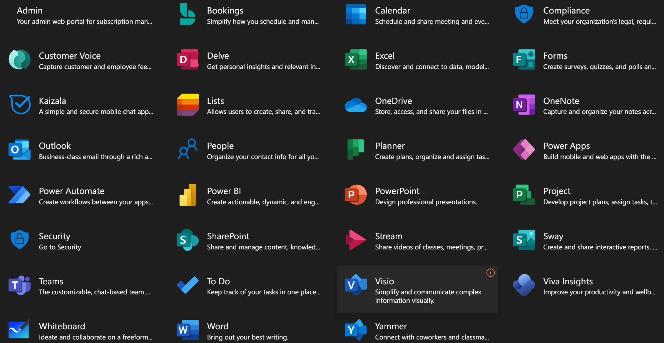 Go to Office.com and login using your corporate id. It is not a part of personal or family versions of Office 365. Firstly, click the 9 dots next to the Office logo and you should see all apps available to you. Below all the app logos you will see All Apps link. Click this link and check if Visio is available. If this does not work, see the bottom of the list of logos – click Explore all your apps. Now you should see Visio.